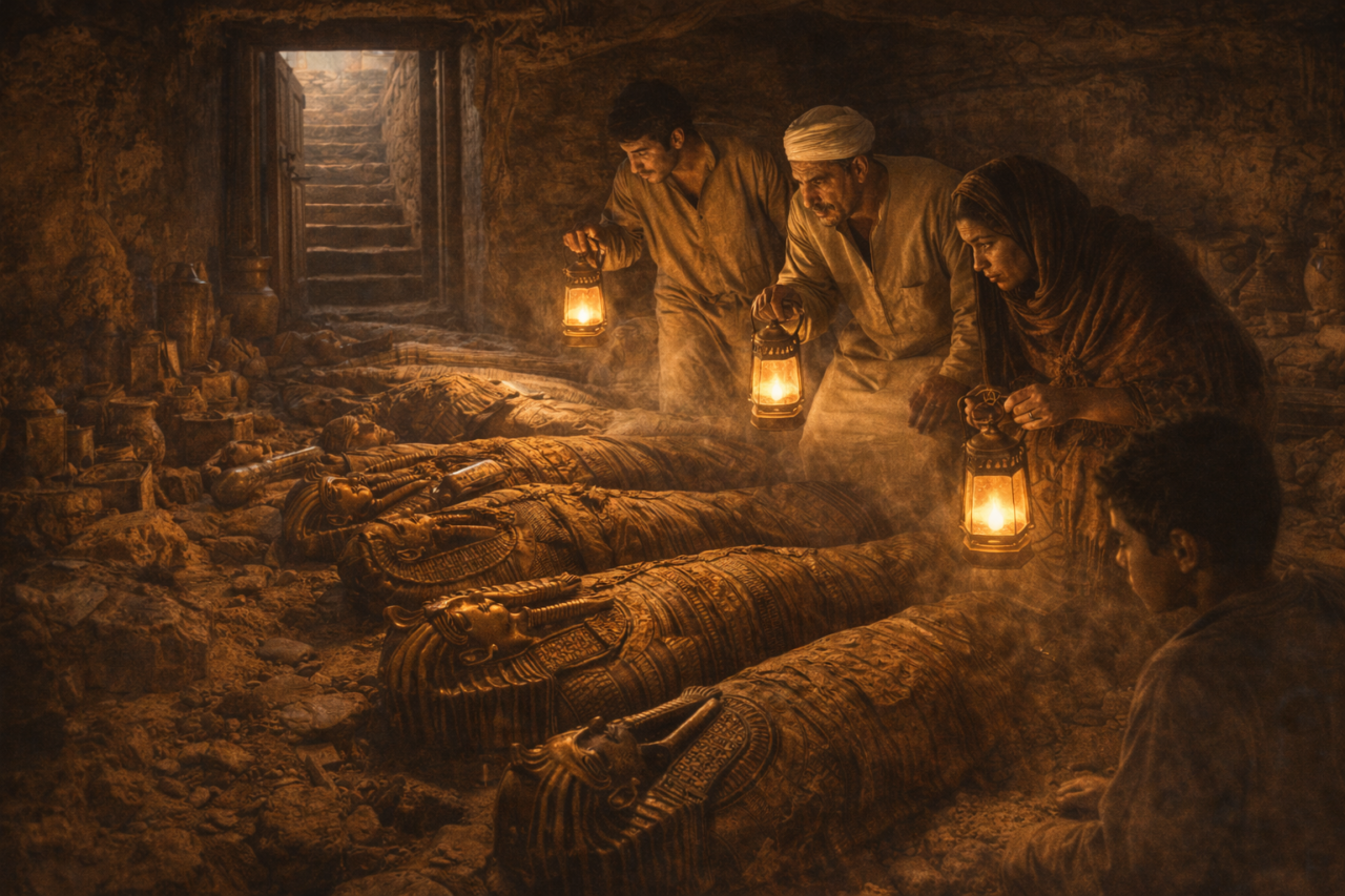 تخيل أن تخرج في صباح يوم عادي لتبحث عن ماعز شاردة من قطيعك، فتتعثر قدمك لتسقط في حفرة مظلمة.. وعندما تشعل عود ثقاب لترى ما حولك، تجد نفسك وجهاً لوجه أمام أعظم ملوك الأرض، نائمين في توابيتهم الذهبية، وتحيط بهم كنوز تكفي لشراء دولة بأكملها!