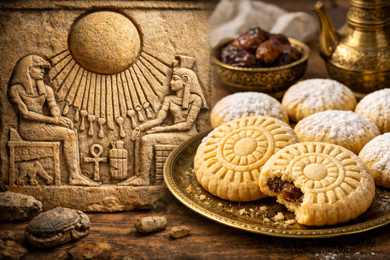 في “أصل الحكاية”، نكتشف أن “كحك العيد” ليس مجرد دقيق وسكر، بل هو “وثيقة تاريخية” قابلة للأكل. قرص شمس فرعوني، تبناه الفاطميون، ورش عليه العثمانيون السكر، وورثناه نحن لنأكله في صباح العيد. في المرة القادمة التي تمسك فيها بالمنقاش لتزيين الكحك، تذكر أنك تمارس طقساً مارسه أجدادك قبل 5000 عام لتقديس نور الشمس!